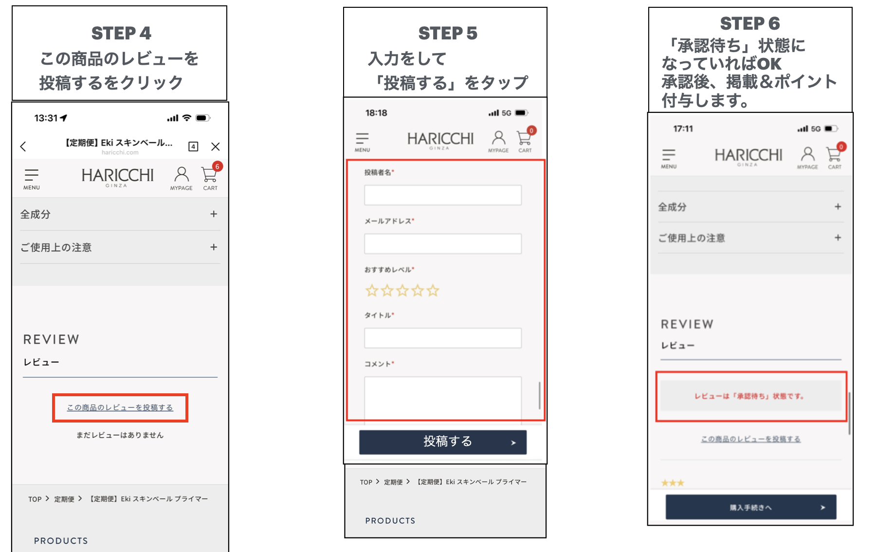 - レビュー投稿の際は、ハリッチ公式オンラインストアのマイページへログインのうえ、購入履歴より該当の「Eki スキンベールプライマー」をお選びいただき、ご投稿ください。